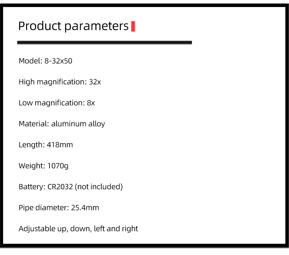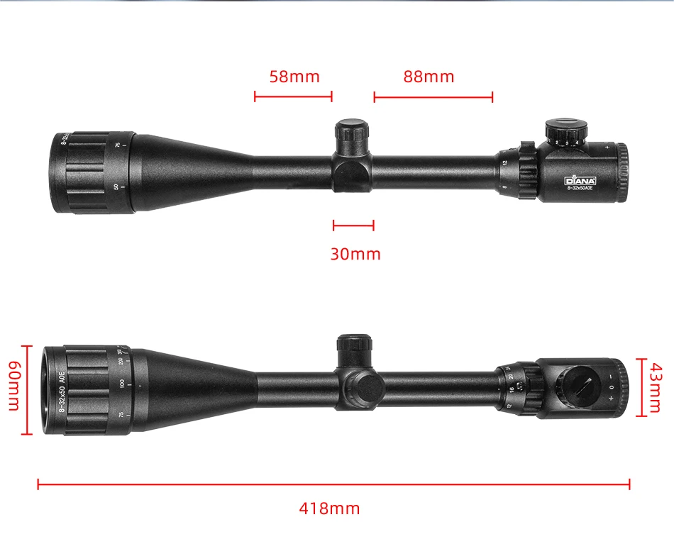 SPECIFICATIONSBrand Name: DIANAFunction: LensHign-concerned Chemical: NoneMagnification: >6Model Number: DIANA 8-32x50Origin: Mainland ChinaType: RIFLE
