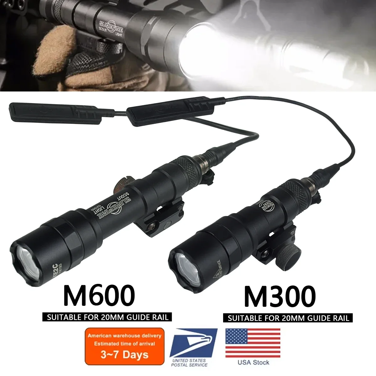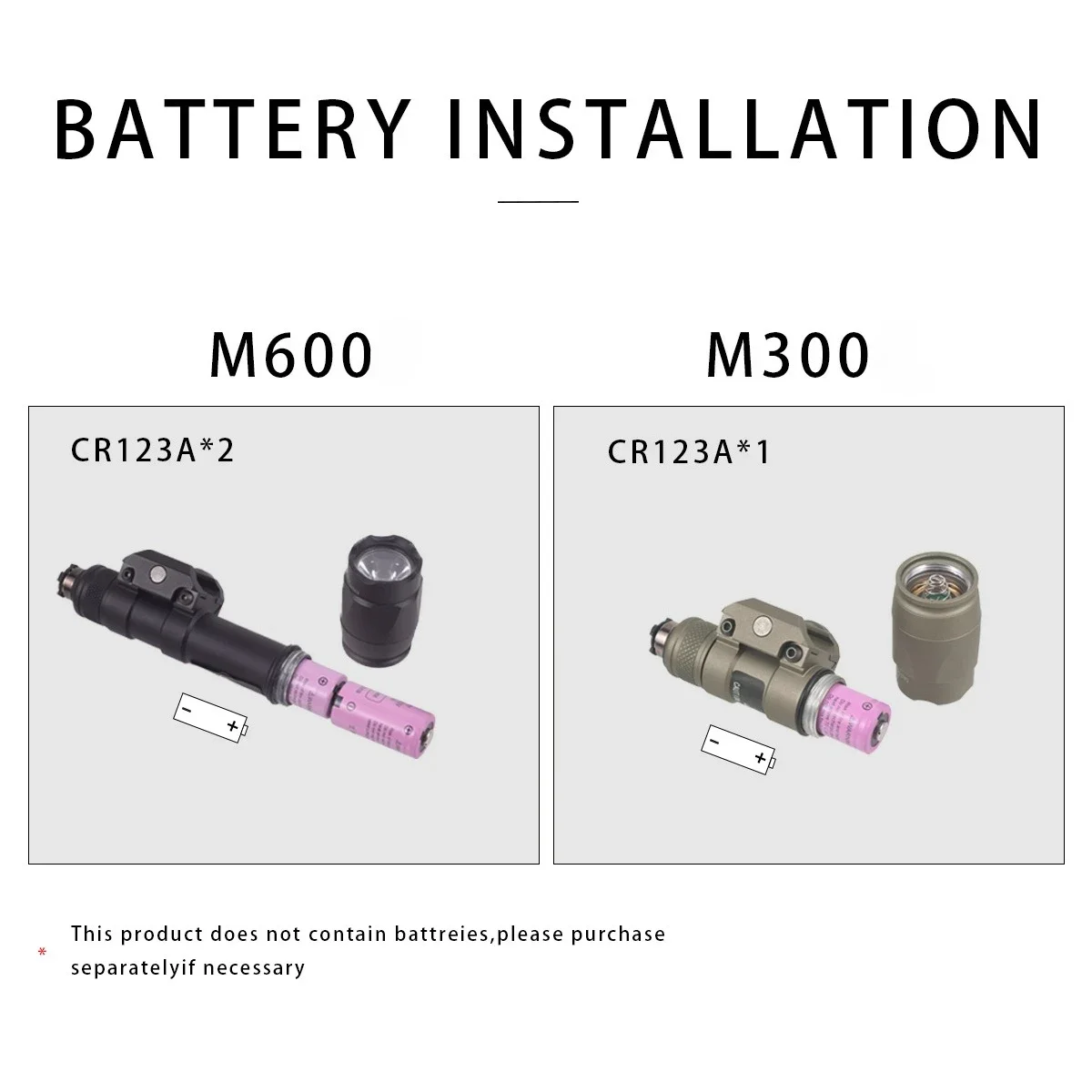 SPECIFICATIONSBatteries are not included: This product does not include batteriesBrand Name: LAMBULFit: 20mm picatinnyHign-concerned Chemical: NoneLight Source: LED bulbsM300 Battery: 1*CR123A or 1*16340 (Not Included)),2*CR123A or 2*16340 (Not Included))M300/M600 Lumen: 500Material: Aluminum alloyModel Number: Surefire M300 M300B M300C M600 X300Origin: Mainland China Attention: Install the battery from the head of...