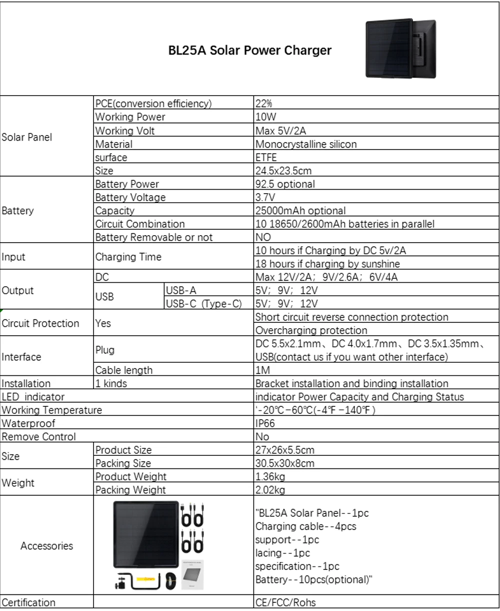 SPECIFICATIONSApplication: Indoor Solar Power SupplyBattery: 10pcs 18650 BatteriesBrand Name: WildgameplusCapacity: Full 25000mAh(NOT Virtual)Charging Power: 10WHign-concerned Chemical: NoneInput Voltge: 5V/2AMAX. Voltage Input: 28VModel Number: WG25000Origin: Mainland ChinaOutput Power: 24WOutput Voltage: 6V/4A; 9V/2.67A; 12V/2APCE (Photoelectric Conversion Efficiency): 22%Panel Material: Carbon FiberProduct: Outdoor Solar Panel Charger KitQuick Charge Type-C port: 20WQuick Charge USB...